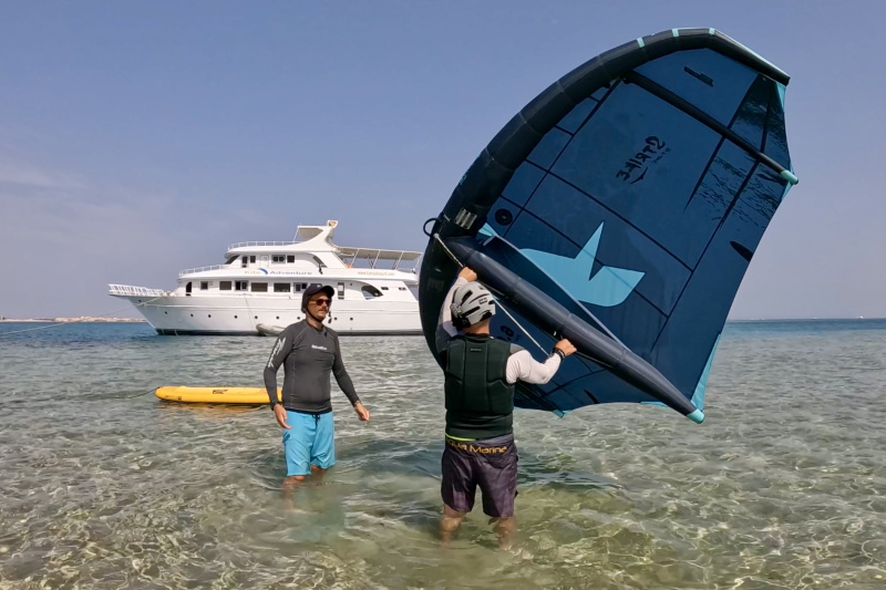 As soon as the boat is anchored at our spot, or you have arrived at the spot with a transfer boat, you can repare for your first kite or wing session of the day.