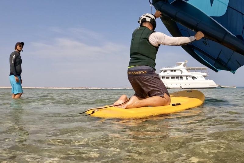 • Riding the wing SUP board on your knees and, if necessary, already standing